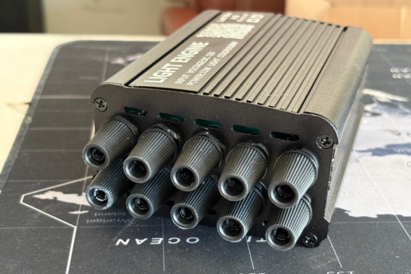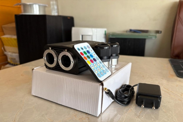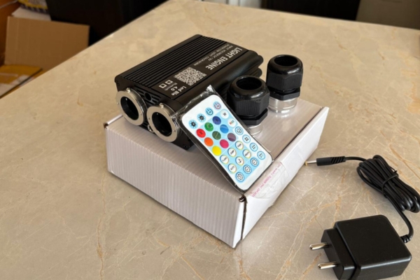 This 32W dual-port optical fiber light engine features a twinkle and shooting star effect, supporting RGBW+White color modes. Controlled via mobile app or remote, it enhances ambiance with vivid lighting. Ideal for star ceilings or decorative displays, it delivers dynamic, customizable illumination with advanced lighting effects and easy control options.